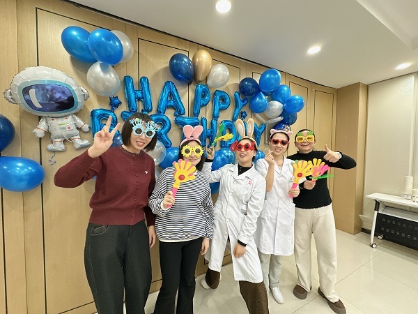 下午四点半,生日会在轻松愉快的音乐中拉开序幕。活动现场被兰石色气球、柔和彩带与“生日快乐”主题背景板装点得格外温馨,甜品台上精美的蛋糕与点心散发着甜蜜的气息。本季度所有寿星与各科室员工代表欢聚一堂,共同见证这一温暖时刻。