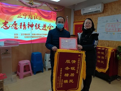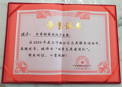 2021年1月8日,由正宁路社区、甘肃兴邦社会工作服务中心举办的“志愿精神促进会”上,甘肃玛丽亚妇产医院医疗志愿服务活动荣获表彰:锦旗一面“情暖居民 服务楷模”;荣誉证书一本“优秀志愿者团队”。这是对玛丽亚医院2020年度医疗志愿服务活动的认可和肯定,极大鼓舞了志愿服务团队的工作信心。